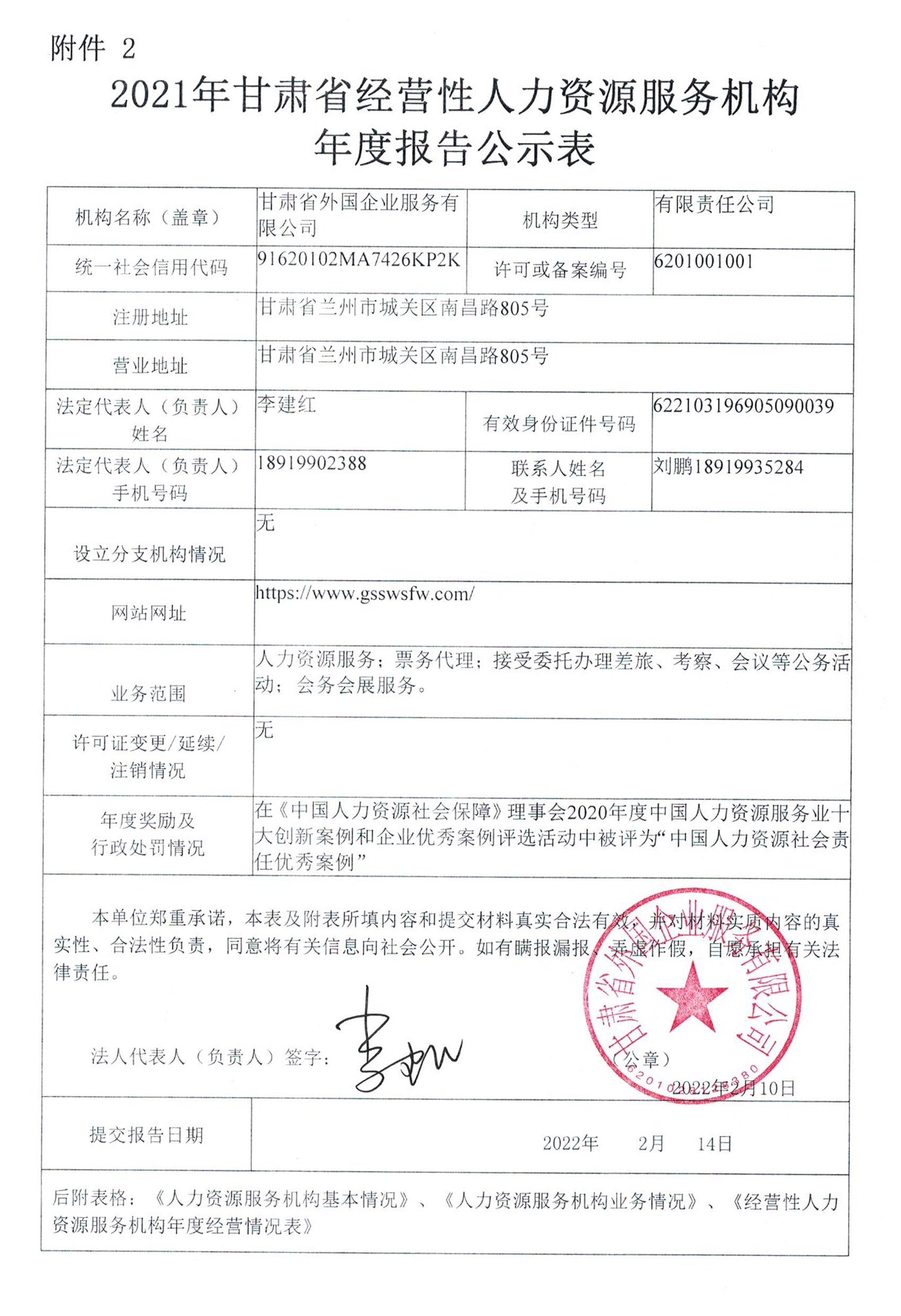 2021年甘肅省經營性人力資源服務機構年度報告公示表