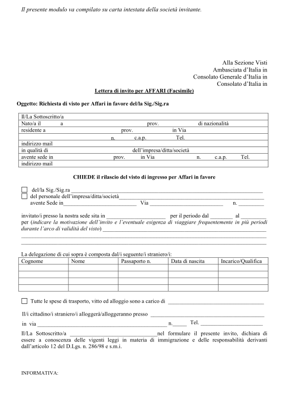 據(jù)意大利駐華使館告,如團(tuán)組以商務(wù)目的申請?jiān)L意簽證,邀請信必須遵照商務(wù)邀請信模板(見附件)格式出具。